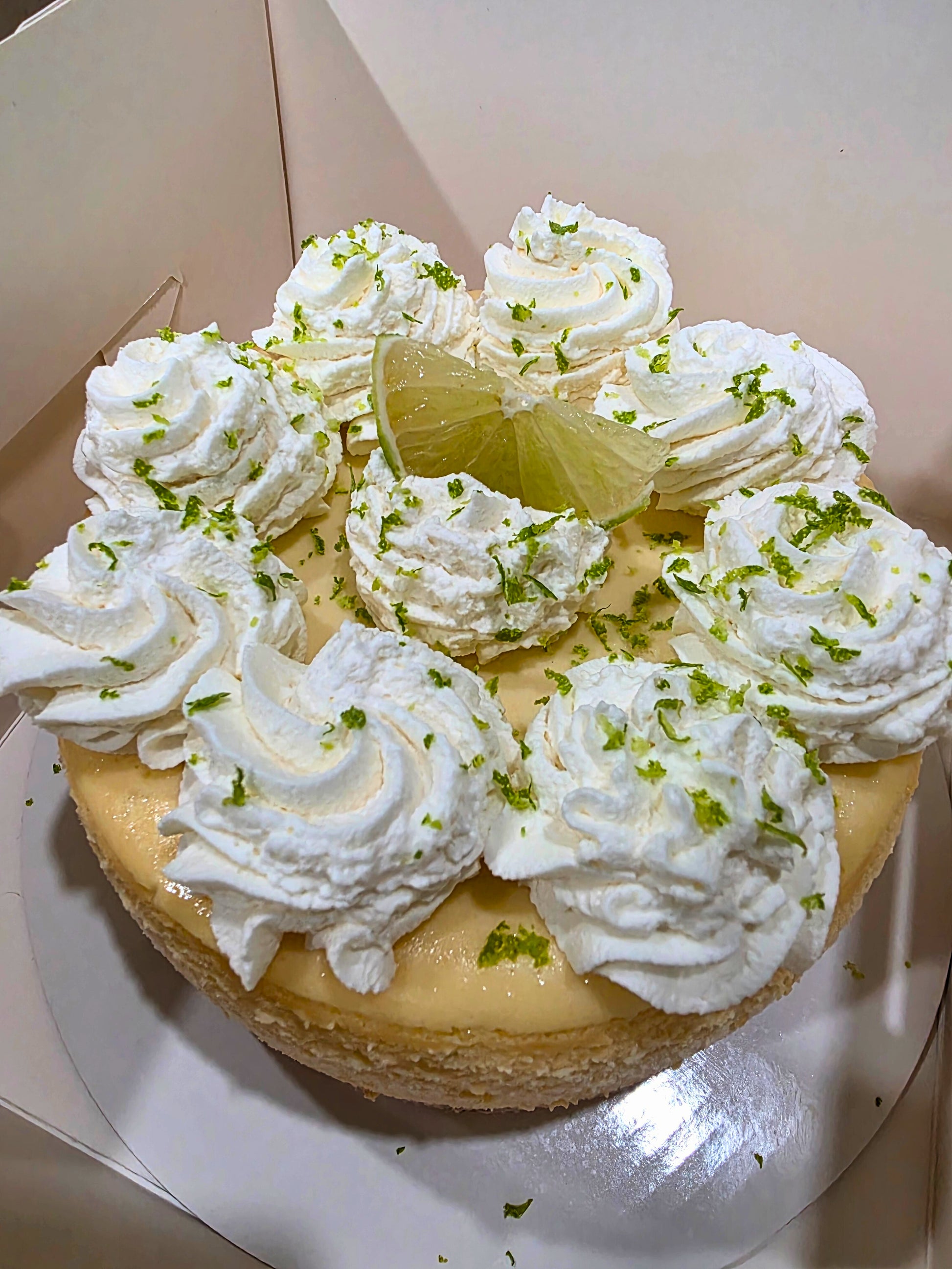 Creamy cheesecake made with 100% lime juice and lime zest on a gluten free graham cracker crust.